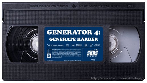 Just enter some text, choose colors and font, and click the 'Go' button. A picture of a videotape will be generated for you. Collect 'em, trade 'em, put 'em on your website, or e-mail 'em to your friends.